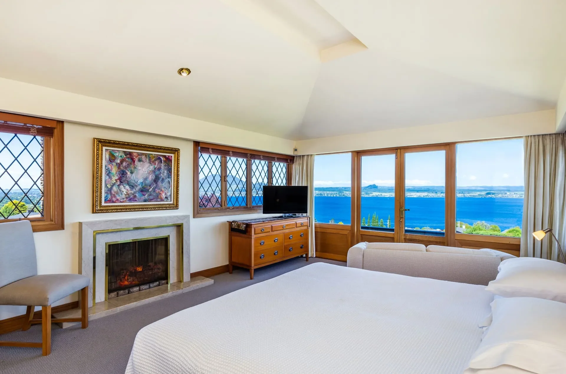 The Lake Suite is the lodge’s premier room, offering sweeping views over Lake Taupō and the surrounding mountains. Spacious and elegantly designed, it features a plush super king bed, a large ensuite bathroom with underfloor heating, luxury New Zealand-made toiletries, and a walk-in shower. A private outdoor seating area overlooking the gardens and lake creates the perfect space to relax. Guests also enjoy complimentary Wi-Fi, a flat-screen TV with Sky channels, and tea and coffee-making facilities.