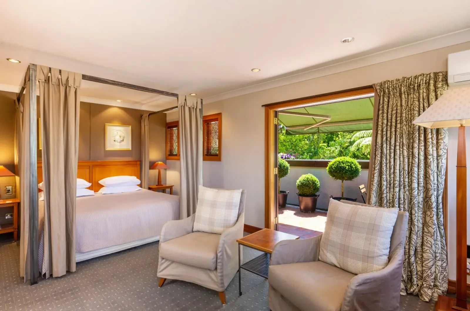 The Cherrywood Suite is a warm and inviting space, designed with soft tones and views across the gardens. It offers a super king bed, ensuite bathroom with walk-in shower, underfloor heating, and boutique New Zealand amenities. Guests enjoy modern comforts including complimentary Wi-Fi, flat-screen TV with Sky channels, and tea and coffee-making facilities. A peaceful retreat, it blends homely charm with understated luxury.